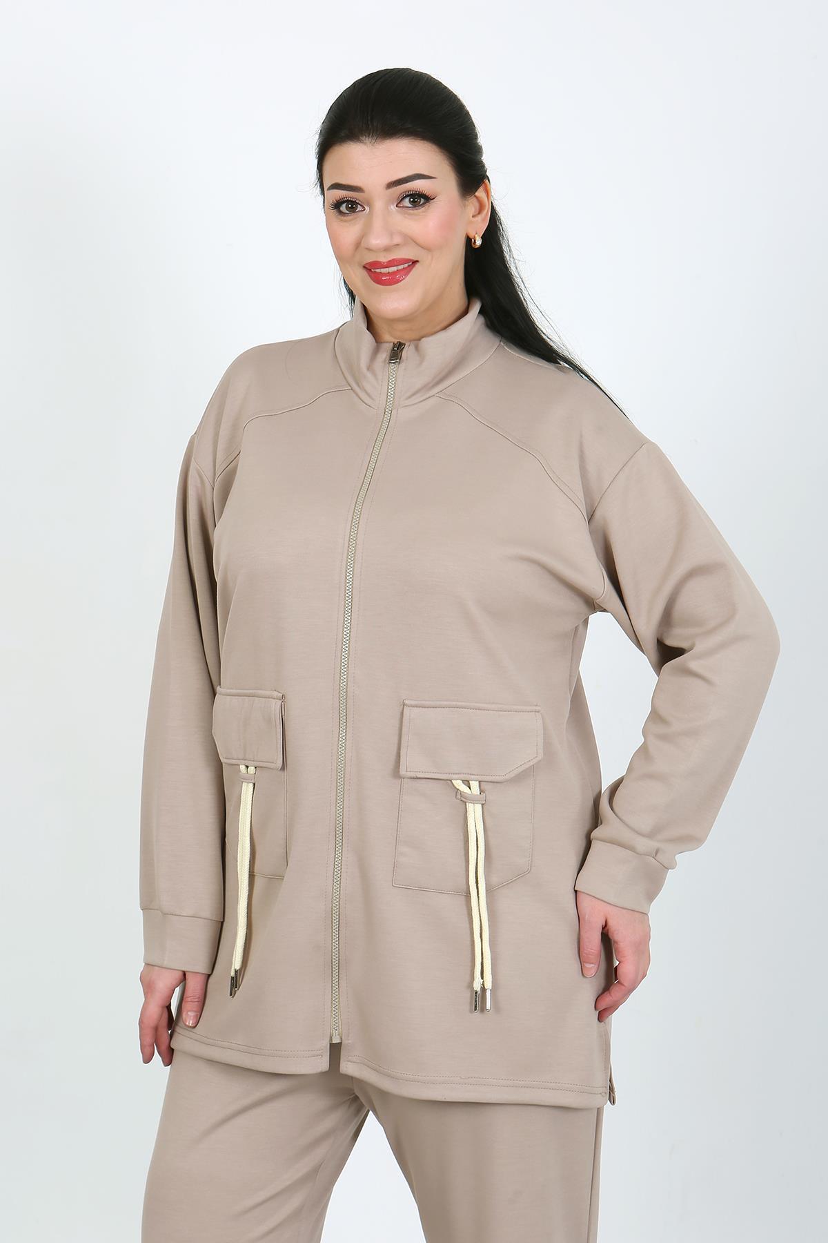 Kadın Krem Rengi Önü Cep Detay Esnek Kumaş Büyük Beden Eşofman Takım