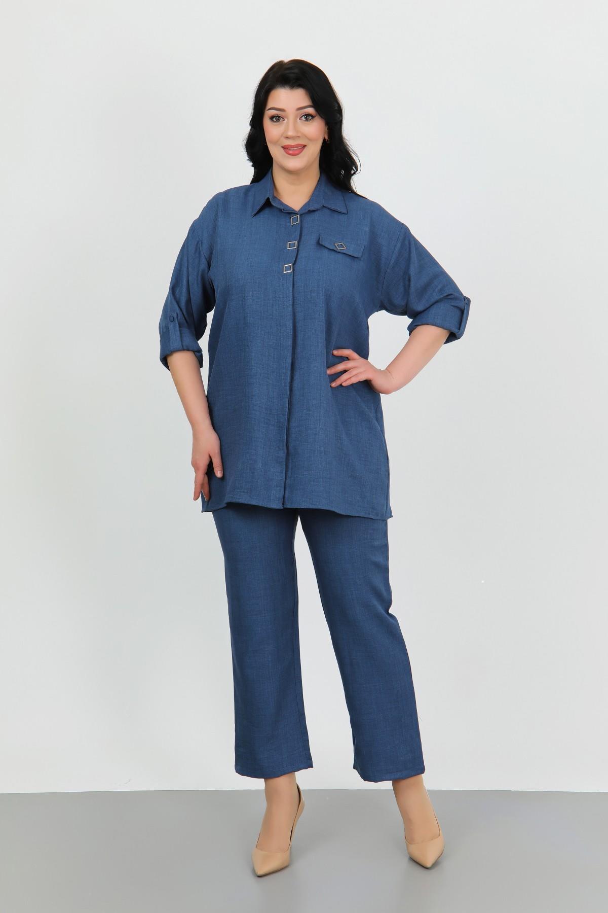 Kadın Lacivert Soft Keten Gömlek Pantolon Büyük Beden İkili Takım