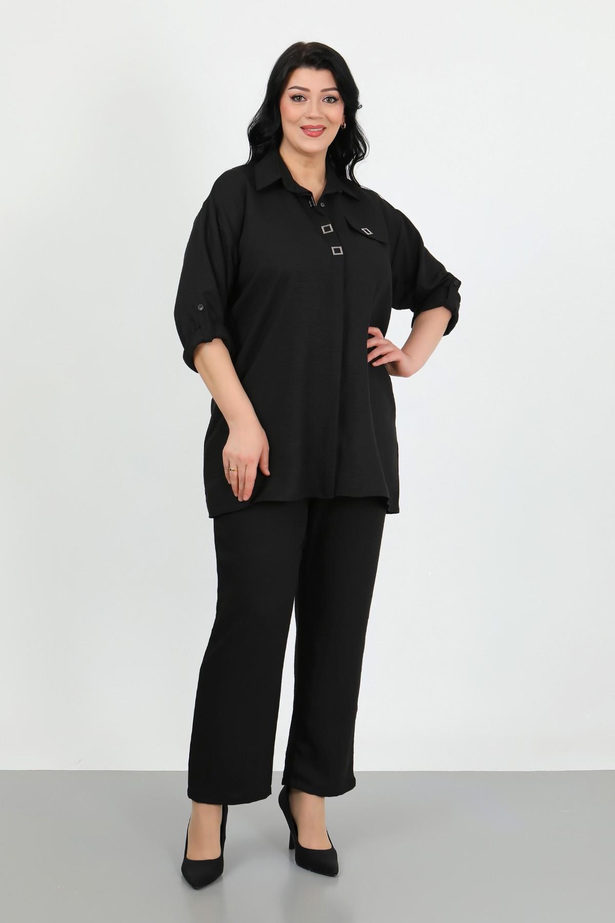 Kadın Siyah Soft Keten Pantolon Gömlek Büyük Beden İkili Takım